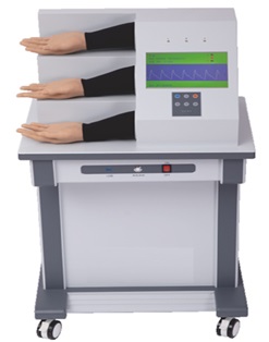 本模拟系统应用仿生模拟及波形合成方法,用高分子材料配方研制仿生手及桡动脉血管;用新型步进调速电机及特制油泵来模拟人体心脏的舒张与收缩;用计算机CPU及软件控制的电磁阀来模拟人体心脏瓣膜的开启状态;用不同粘度的硅油来模拟代替人体血液;从而在仿生手的挠动脉处模拟出30多种人体常见典型的脉搏特征。这些脉象是中医八纲脉的典型,是临床辨证的基础。本模拟系统作为中医脉象再现的信号源,可用于脉诊的教学、远程诊断、亦可用于脉象形成机理的体外实验研究以及作为脉象仪生产企业的标准信号源。