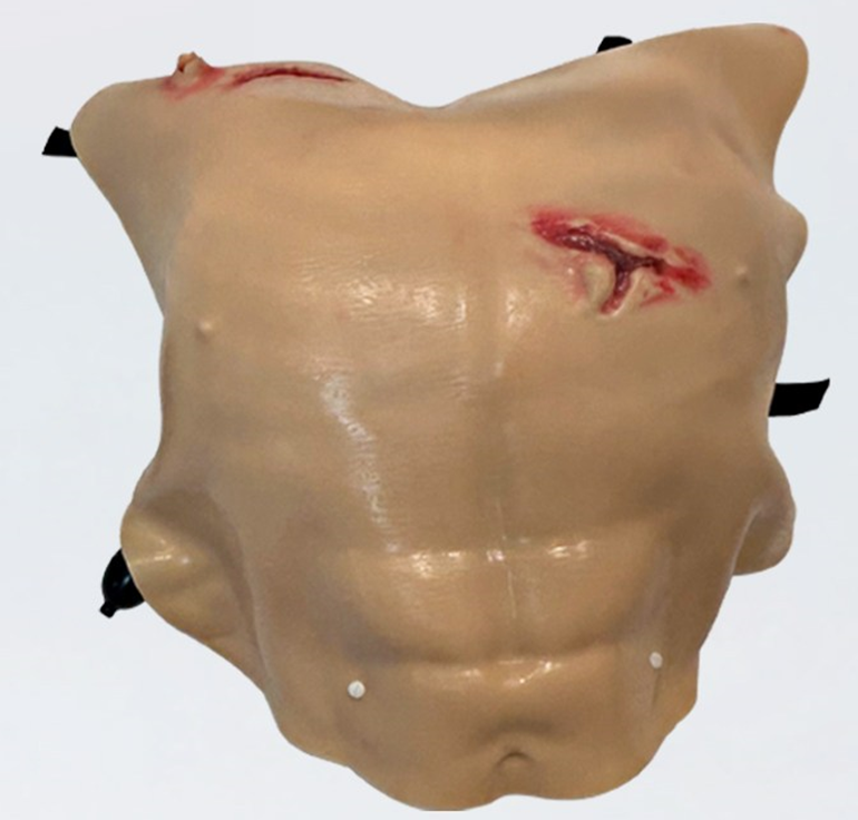 5.模拟战场伤员胸部创伤后多发创伤性血气胸效果,并可进行张力性气胸穿刺及护理训练。